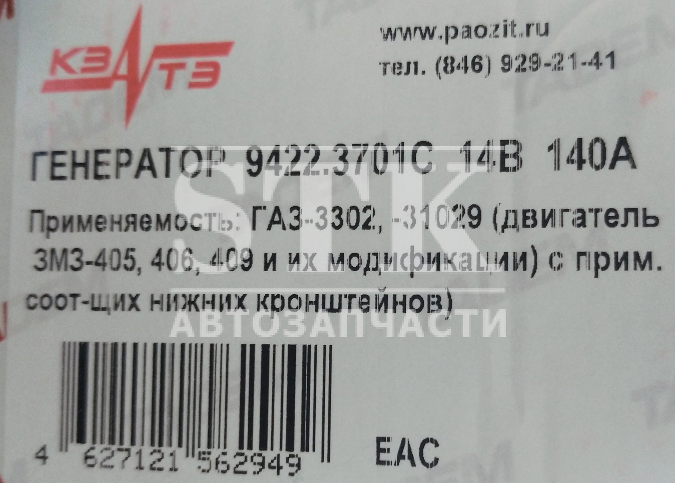КЗАТЭ Генератор 9422.3701000С Ув. Мощности 14V - 140А а\м G.z -31029; 3302; 3110 с дв. ЗМЗ 406.10, 4061,10 4062,10 пр-во ЗиТ, КзатЭ г. Самара Артикул 031031 6 620 руб. Количество В корзину
